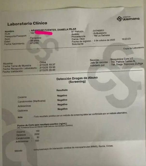 Finalmente, Daniela Aránguiz compartió el resultado de su examen en sus redes sociales, descartando el consumo de sustancias.