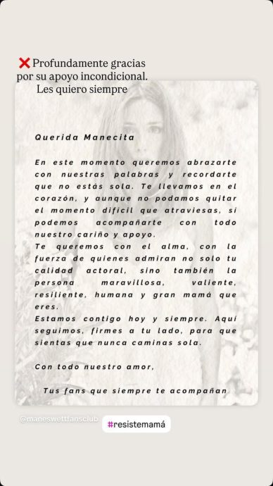 «Te queremos con el alma, con la fuerza de quienes admiran no solo tu calidad actoral, sino también la persona maravillosa, valiente, resiliente, humana y gran mamá que eres. Estamos contigo hoy y siempre. Aquí seguimos, firmes a tu lado, para que sientas que nunca caminas sola. Con todo nuestro amor, tus fans que siempre te acompañan», agregaron.