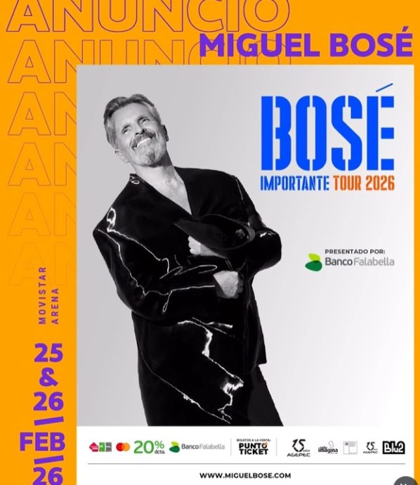 El cantante español Miguel Bosé confirmó su esperado regreso a Chile con su gira «Importante Tour», que lo llevará al Movistar Arena los días 25 y 26 de febrero de 2026.