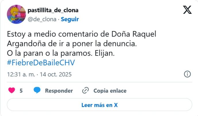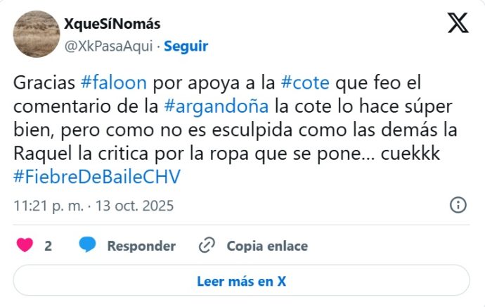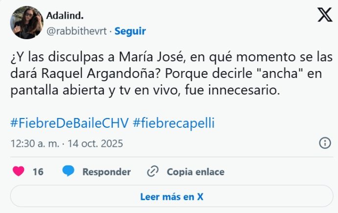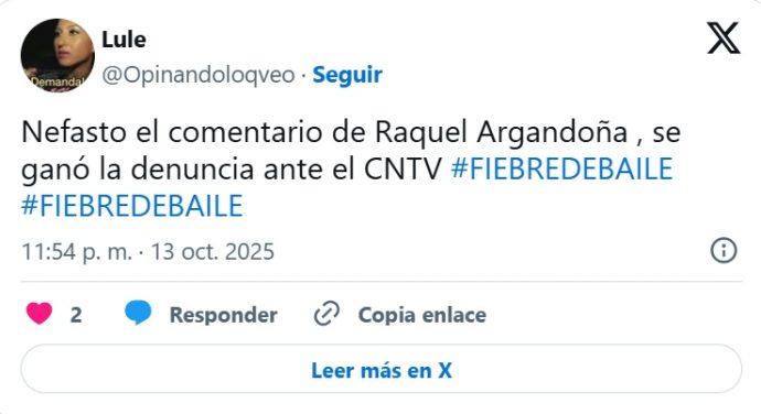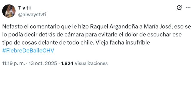 La noche del lunes, Chilevisión emitió un nuevo capítulo de su estelar «Fiebre de Baile», donde Raquel Argandoña, miembro del jurado, desató una nueva polémica tras referirse al cuerpo de una de las participantes: María José Quiroz.