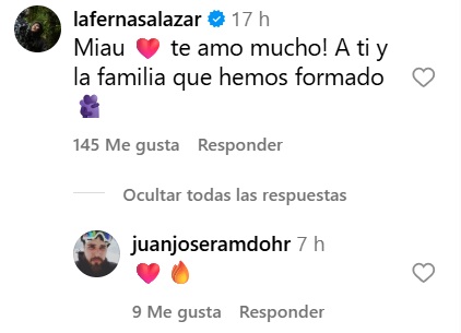 Por su parte, la actriz le respondió: «Miau ❤️, ¡te amo mucho! A ti y a la familia que hemos formado 🫂»