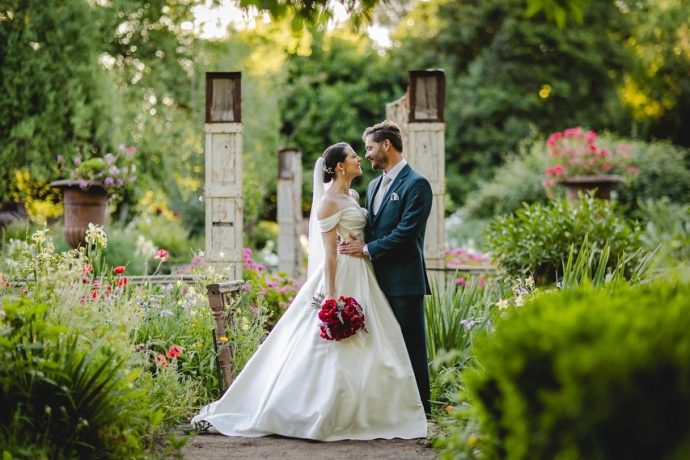 Las fotografías muestran a la actriz luciendo un elegante vestido blanco con una larga cola, mientras que su esposo destaca con un impecable traje formal.