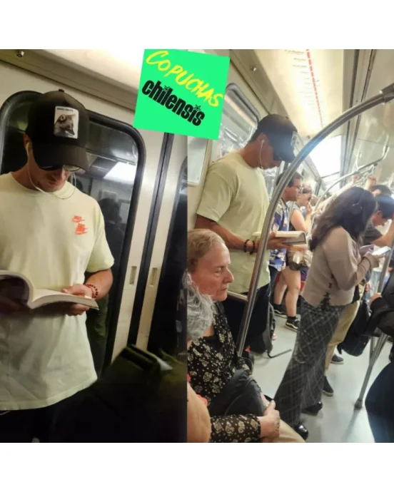 La cuenta de Instagram Copuchas Chilenas publicó una imagen donde se ve al personal trainer viajando en el metro, vestido con jockey, lentes y leyendo un libro.