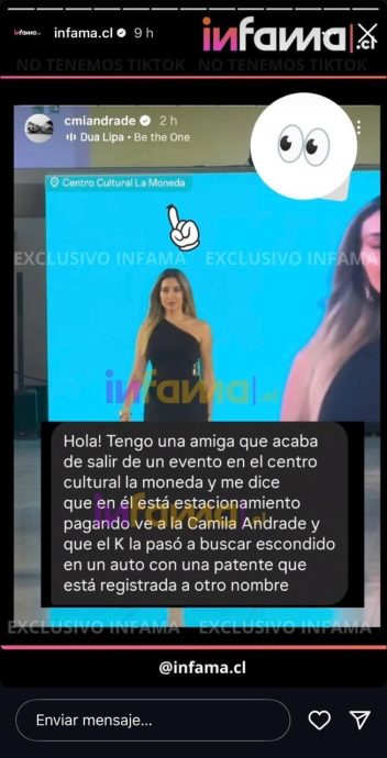 Desde el medio Infama compartieron un mensaje enviado por un seguidor. Según el mensaje, una amiga habría visto a Andrade saliendo de un evento en el Centro Cultural La Moneda, y en los estacionamientos, Kaminski habría llegado a buscarla en un vehículo cuya patente estaría registrada a nombre de otra persona.