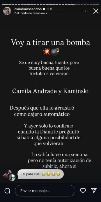 Cabe mencionar que, hasta el momento, ni Camila Andrade ni Francisco Kaminski han confirmado oficialmente su posible reconciliación.