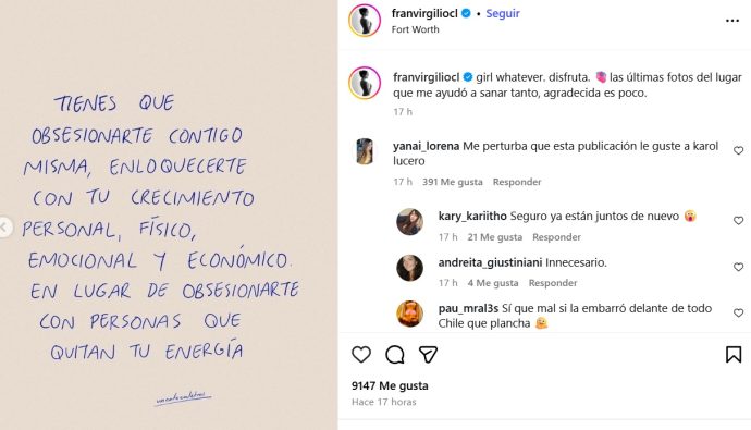 El gesto generó todo tipo de comentarios, entre los que destacan: «Me perturba que esta publicación le guste a Karol Lucero», «Sí que mal, se la embarró delante de todo Chile 🫠», «X 1000 que mal», «Su manera de buscar llamar la atención, ni haciéndose preguntas a él mismo y contestando las tonteras que pone, el narcisista que es siempre será así», «¿Por qué Kakás le dio ‘me gusta’? Wtf» y «Qué pena que para Karol sea más importante colocar su ‘like’ en esta publicación para que todos lo vean (ego), en vez de cuidar la exposición de Fran… aquí se nota que sigue pensando solo en él».