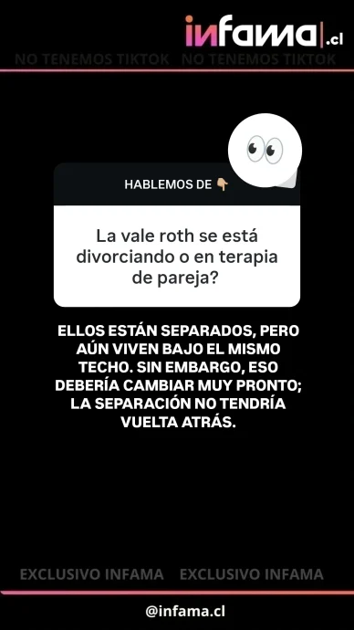 Según informó el portal Infama, Roth y de la Fuente estarían en pleno proceso de separación. Esto se conoció luego de que un usuario preguntara: «¿Vale Roth se está divorciando o está en terapia de pareja?».