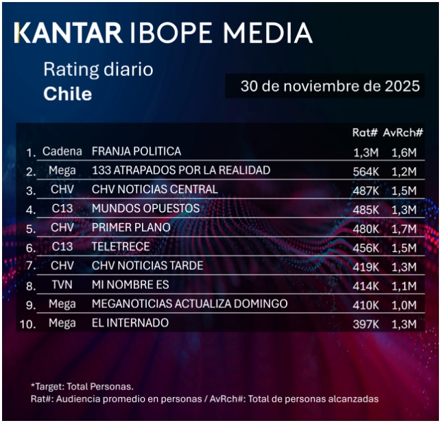 Rating TV chilena: los programas más vistos del domingo 30 de noviembre