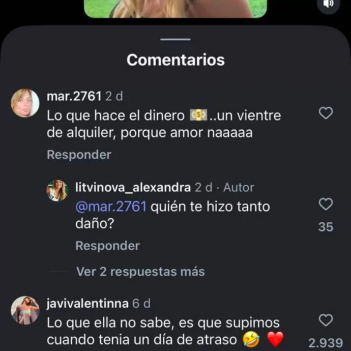 Una usuaria escribió: «Lo que hace el dinero, un vientre de alquiler, porque amor naaaa», a lo que Alexandra respondió con contundencia: «¿Quién te hizo tanto daño?».