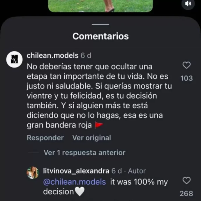 Otra persona comentó: «No deberías tener que ocultar una etapa tan importante de tu vida. No es justo ni saludable. Si querías mostrar tu vientre y tu felicidad, es tu decisión. Y si alguien más te está diciendo que no lo hagas, esa es una gran bandera roja». Alexandra aclaró que mantener la noticia en secreto fue 100% su decisión.