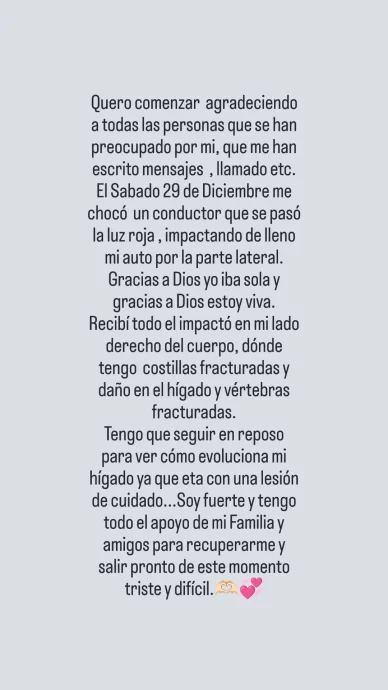 «Quiero comenzar agradeciendo a todas las personas que se han preocupado por mí, que me han escrito y llamado. El sábado 29 de noviembre un conductor que se pasó la luz roja chocó mi auto de lleno por la parte lateral», explicó. Luego añadió: «Gracias a Dios iba sola y gracias a Dios estoy viva».