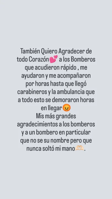 Finalmente, Sobarzo también dedicó palabras de agradecimiento a Carabineros, Bomberos y al equipo que la asistió inmediatamente tras el accidente.
