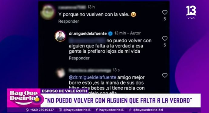El caso fue abordado por el programa «Hay que decirlo» de Canal 13, donde Roth entregó su versión y ofreció nuevos antecedentes sobre la separación: «Lo confirmé para que no le escriban en redes sociales… porque eso le puede influir en su trabajo. Y como es el papá de mis niñas, yo quiero que le vaya bien», explicó Valentina Roth.