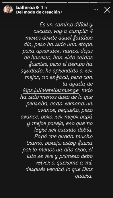 Reflexionando sobre su proceso personal, afirmó: «Es un camino difícil y oscuro. Voy a cumplir cuatro meses desde aquel fatídico día, pero ha sido una etapa para aprender. Han sido caídas fuertes, pero el tiempo ha ayudado; he aprendido a ser mejor. Con ayuda del psicólogo, todo ha sido menos duro de lo que pensaba».