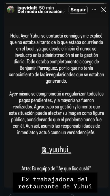 Paralelamente, Cecilia Gutiérrez compartió el testimonio de un trabajador del local, quien confirmó que Yuhui se comunicó con el equipo y comenzó a gestionar los pagos pendientes, dando por encaminada la resolución del conflicto.