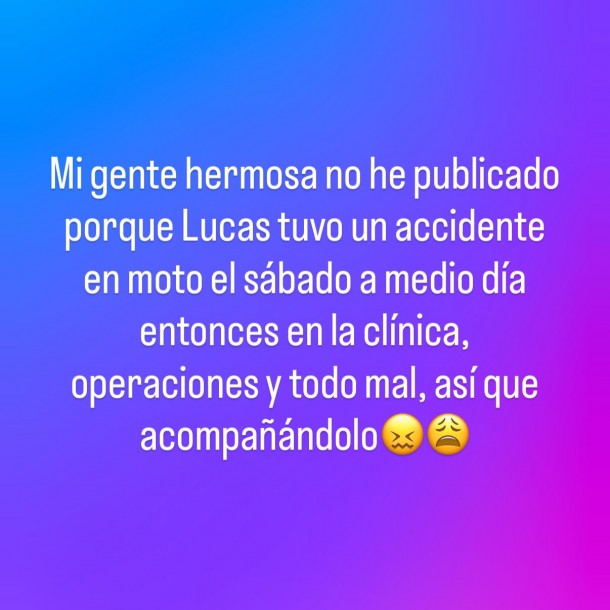«Mi gente hermosa, no he publicado porque Lucas tuvo un accidente en moto el sábado a mediodía, entonces he estado en la clínica, operaciones y todo mal, así que estoy acompañándolo», explicó Coté, sin entregar mayores detalles sobre el estado del joven.