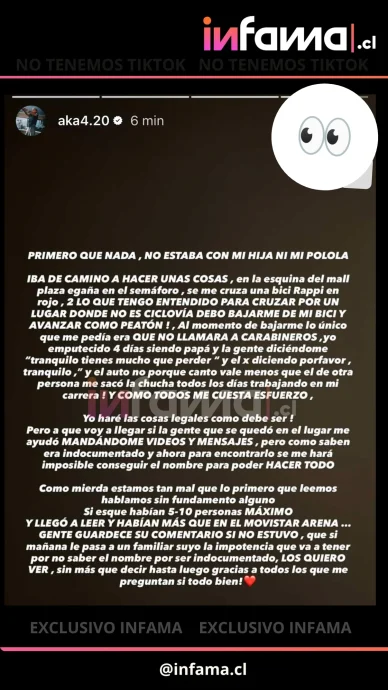 Ahora, el nombre de Aka 4:20 vuelve a aparecer en titulares luego de que se diera a conocer su presunta participación en un accidente de tránsito que habría afectado a un ciclista repartidor de una aplicación de delivery, hecho que fue difundido inicialmente por el portal de espectáculos Infama.