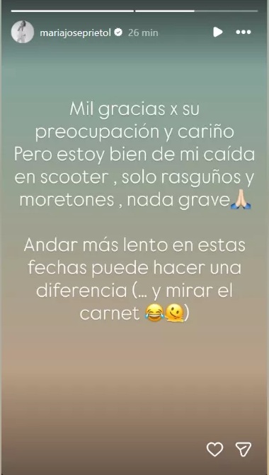 Finalmente, María José Prieto publicó un mensaje de agradecimiento por el apoyo recibido: «Mil gracias por su preocupación y cariño, pero estoy bien de mi caída del scooter. Solo rasguños y moretones, nada grave. Andar más lento en estas fiestas puede hacer una diferencia (…y mirar el carnet)», cerró tomándose con humor lo sucedido.