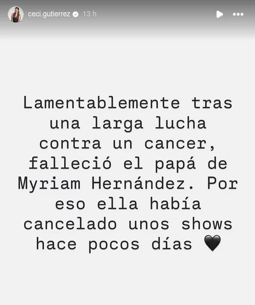 Hasta el momento, Miryam Hernández no se ha referido públicamente a esta pérdida. Sin embargo, quienes siguen a la cantante saben de la estrecha relación que mantenía con su padre, a quien solía dedicar emotivos mensajes en sus redes sociales, reflejando el cariño y la cercanía que los unía.