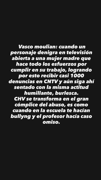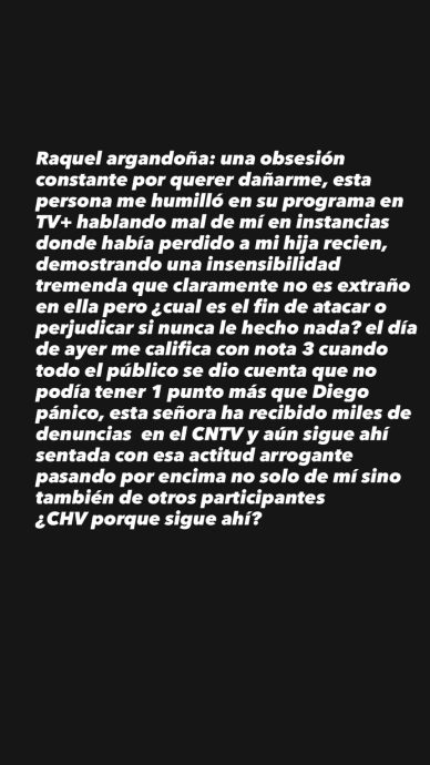 Posteriormente, la española profundizó en sus declaraciones a través de una serie de publicaciones, donde cuestionó duramente el trato recibido dentro del programa. En sus mensajes, apuntó contra dos miembros del jurado: Vasco Moulian y Raquel Argandoña, acusando actitudes que, según ella, la afectaron emocionalmente.