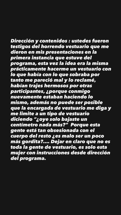 Además, aseguró que el vestuario que le asignaban era distinto al del resto de las participantes, calificándolo de «horrendo», y denunció que su peso habría sido objeto de comentarios por parte de miembros de la producción, situación que consideró inaceptable.