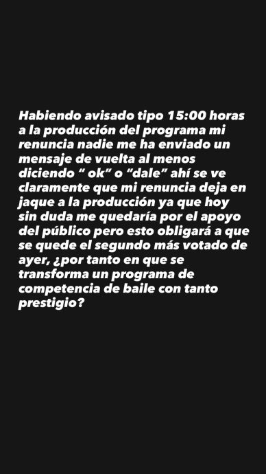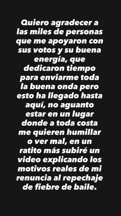 Sin embargo, horas antes de volver a presentarse, la exintegrante del programa utilizó su cuenta de Instagram para comunicar que no continuaría en el repechaje. En un mensaje directo y contundente, agradeció el apoyo recibido, pero explicó que decidió dar un paso al costado. «No aguanto estar en un lugar donde a toda costa me quieren humillar o ver mal», señaló.