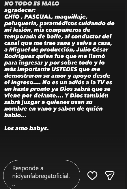 Finalmente, Nidyan Fabregat afirmó que, tras presentar su renuncia, nadie del programa se habría contactado con ella, agregando que «Fiebre de Baile» normalizaría prácticas que vulneran y promueven malos tratos hacia las mujeres, acusación que reavivó el debate en redes sociales.