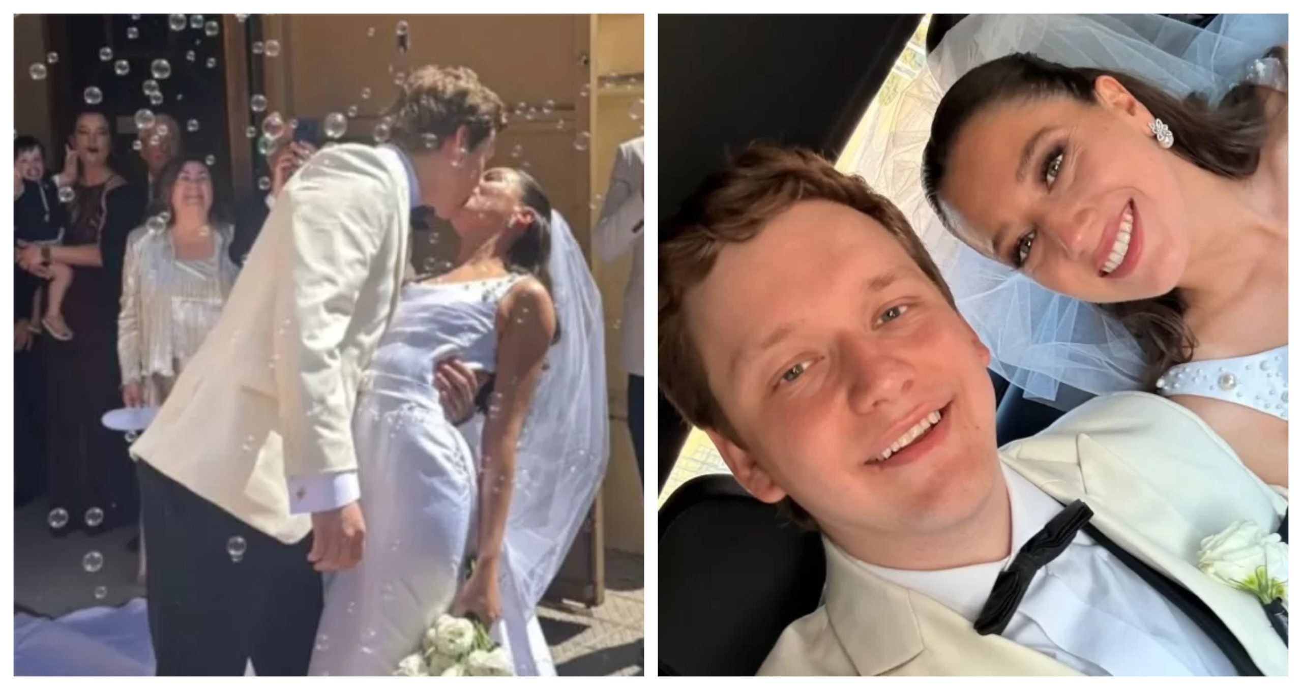 A través de redes sociales, comenzaron a circular los primeros registros de la boda. La periodista se lució con un vestido blanco con cola larga, confeccionado en tela lisa y con corte copihue, diseñado por el reconocido diseñador chileno Heri Levi. Por su parte, Mariano Serce destacó con un smoking de chaqueta color ostra, elegante y acorde con la ocasión.