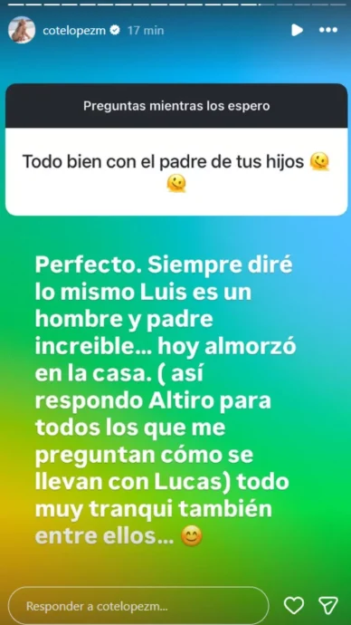 Con estas declaraciones, Coté López reafirma que Luis Jiménez y Lucas Lama mantienen una buena relación, y que la familia convive en armonía. En sus redes sociales, López también ha mostrado que Lucas comparte con los hijos diariamente, consolidando un vínculo cercano entre ellos.