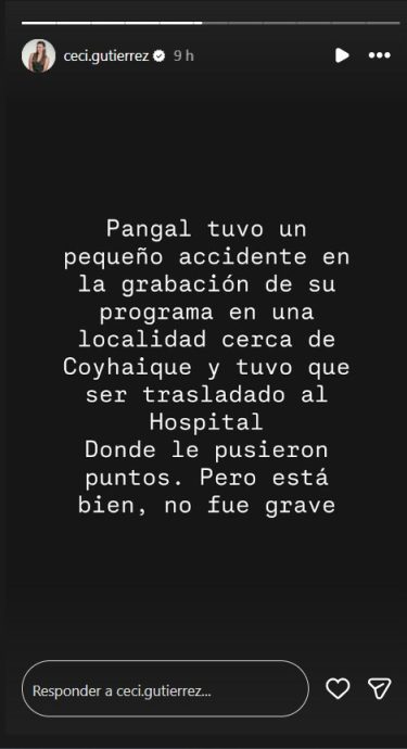 «Pangal tuvo un pequeño accidente en la grabación de su programa en una localidad cerca de Coyhaique y tuvo que ser trasladado al hospital, donde le pusieron puntos. Pero está bien, no fue grave», señaló Gutiérrez, asegurando que el incidente no reviste gravedad.