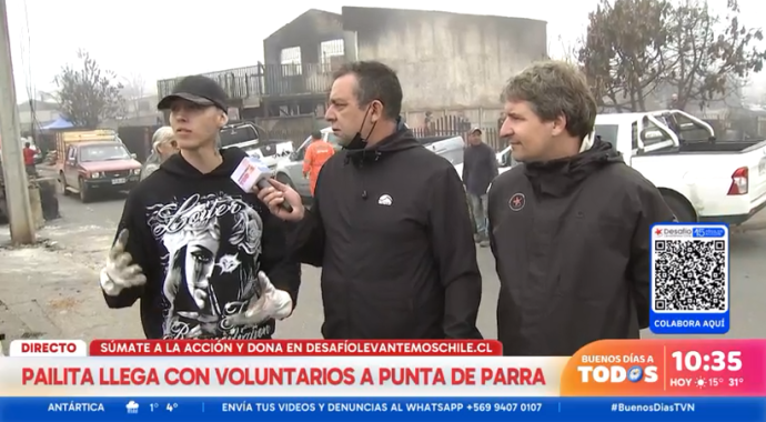 El artista relató su experiencia en el terreno y la importancia de brindar ayuda a las familias afectadas: «Vinimos aquí a Punta de Parra a colaborar con la gente, nos dijeron que acá no había venido mucha gente, entonces estamos tratando de ayudar a las familias a sacar los escombros», comentó.