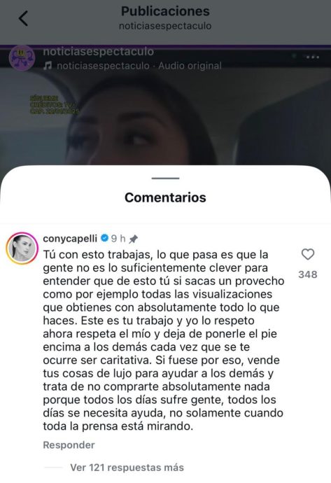 La situación escaló cuando el medio digital Noticias y Espectáculos publicó un registro en el que se hacía referencia a Cony Capelli. Frente a ello, la ex chica reality decidió responder públicamente a Naya Fácil y defender su postura.