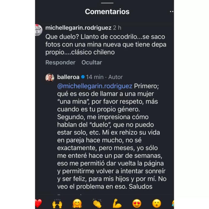 En medio de la discusión, Ballero también respondió a un comentario crítico de una usuaria, quien escribió: «¿Qué duelo? Llanto de cocodrilo…se saco fotos con una mina nueva que tiene depa propio….clásico chileno».