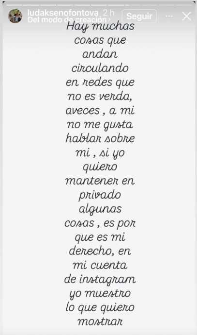 «Hay muchas cosas que andan circulando en redes que no son verdad. A veces, a mí no me gusta hablar sobre mí; si yo quiero mantener en privado algunas cosas, es porque es mi derecho. En mi cuenta de Instagram yo muestro lo que quiero mostrar», señaló Ludmila.