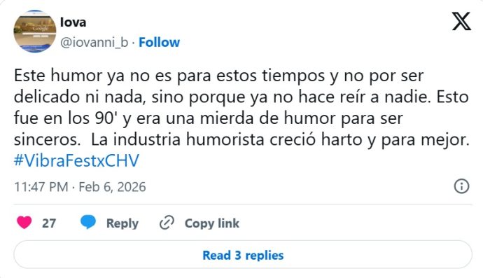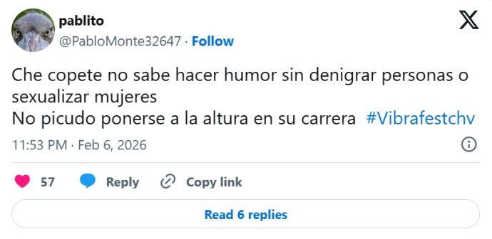 En la plataforma X, se compartieron numerosas reacciones, donde los internautas manifestaron su descontento y críticas hacia Belloni por su presentación en el festival, generando un intenso debate sobre el humor y los límites en los shows en vivo.