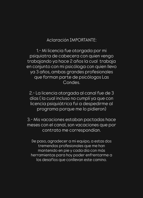 Tras estas declaraciones, Constanza Capelli decidió aclarar la situación a través de una historia en su cuenta de Instagram. La bailarina escribió: «Aclaración IMPORTANTE: Mi licencia fue otorgada por mi psiquiatra de cabecera, con quien vengo trabajando ya hace 2 años. Ella trabaja en conjunto con mi psicóloga, con quien llevo ya 3 años, ambas grandes profesionales que forman parte de Psicólogos Las Condes».