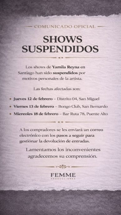 Hasta el momento, ni Yamila Reyna ni Américo se han referido públicamente a estos nuevos antecedentes ni al supuesto quiebre. Sin embargo, la comediante sorprendió este miércoles al anunciar la suspensión de una serie de eventos programados para los próximos días, señalando motivos personales a través de sus redes sociales, sin entregar mayores detalles.