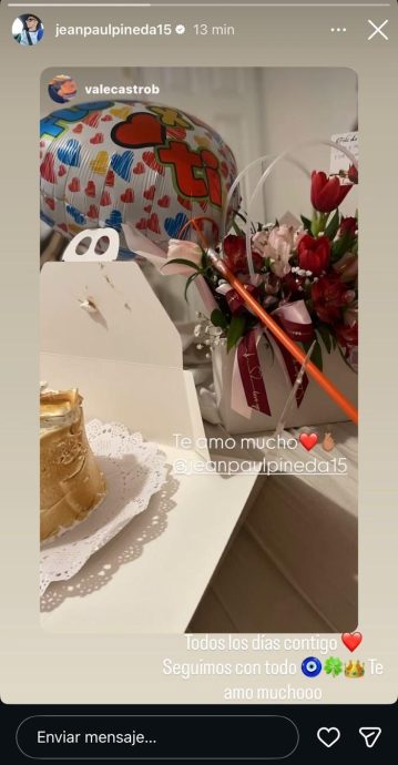 En su cuenta de Instagram, Valentina Castro mostró los regalos que recibió de su pareja: un bolso decorado con flores, un globo con un mensaje romántico y una torta especial. Estas publicaciones fueron reposteadas por Pineda.