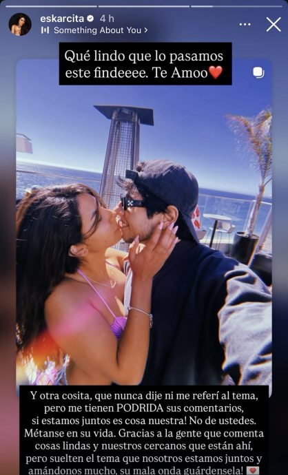 Ahora, tras aparecer públicamente junto a Julitroz, la modelo se defendió de sus detractores con declaraciones contundentes: «Nunca dije ni me referí al tema, pero me tienen PODRIDA con sus comentarios, si estamos juntos es cosa nuestra, no de ustedes», expresó Eskarcita.