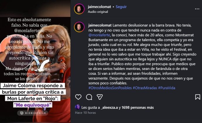 Este intercambio volvió a cobrar relevancia en redes sociales tras el festival, generando cientos de comentarios celebrando los premios de Mon Laferte y recordando aquel episodio de «Rojo». Frente a la repercusión, Jaime Coloma decidió aclarar su postura.
