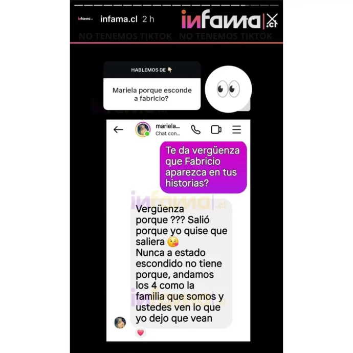 Al regresar a Chile esta semana y tras recibir numerosos mensajes sobre el tema, Mariela decidió responder directamente a un seguidor que le preguntó: «¿Te da vergüenza que Fabricio aparezca en tus historias?».
