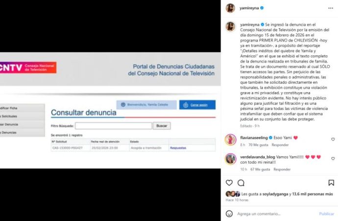 «Se ingresó la denuncia en el Consejo Nacional de Televisión por la emisión del día domingo 15 de febrero de 2026… hoy ya en tramitación», escribió Reyna en su cuenta de Instagram. La comediante agregó que la filtración se produjo en el reportaje titulado «¡Detalles inéditos del quiebre de Yamila y Américo!», donde se exhibió el texto completo de la denuncia presentada en tribunales de familia.