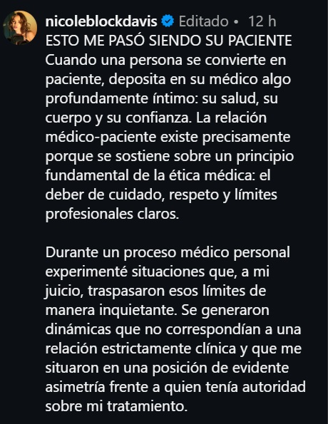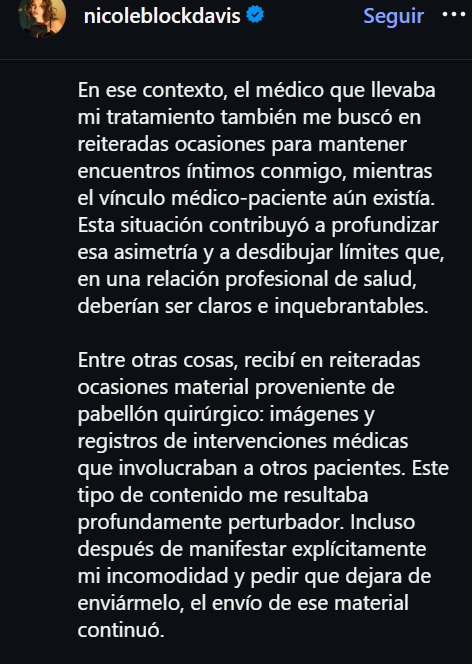 «Durante un proceso médico personal experimenté situaciones que, a mi juicio, traspasaron esos límites de manera inquietante (…) el médico que llevaba mi tratamiento también me buscó en reiteradas ocasiones para mantener encuentros íntimos conmigo, mientras el vínculo médico-paciente aún existía», aseguró Block.