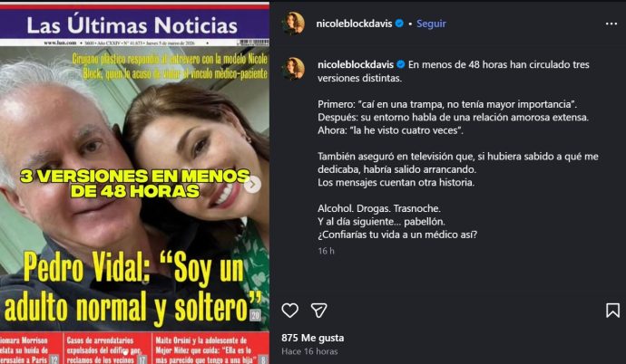 Finalmente, Nicole Block volvió a arremeter contra Pedro Vidal. En su última publicación de Instagram, destacó la contradicción en los dichos del médico: «En menos de 48 horas han circulado tres versiones distintas. Primero: ‘caí en una trampa, no tenía mayor importancia’. Después: su entorno habla de una relación amorosa extensa. Ahora: ‘la he visto cuatro veces’».