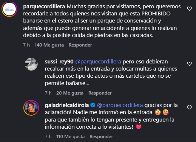 Sin embargo, la publicación rápidamente generó críticas entre sus seguidores. La razón: bañarse en ese parque está prohibido, ya que se trata de un área de conservación. Los cuestionamientos llegaron no solo de sus fans, sino también de la cuenta oficial del parque, que comentó su publicación: «Muchas gracias por visitarnos, pero queremos recordarle a todos quienes nos visitan que está PROHIBIDO bañarse en el estero al ser un parque de conservación y además que puede generar un accidente a quienes lo realizan debido a la posible caída de piedras en las cascadas».