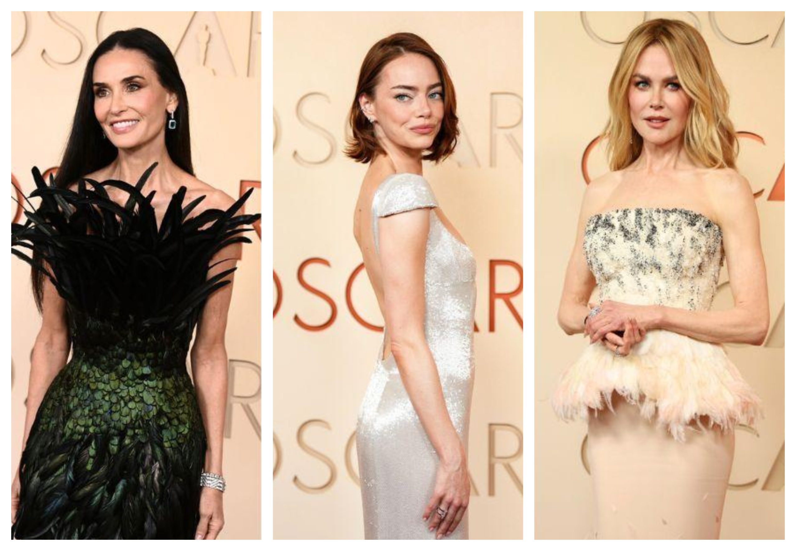 Por su parte, Demi Moore deslumbró con un llamativo vestido negro con detalles en verde y aplicaciones de plumas, un diseño que resaltó su estilizada figura.