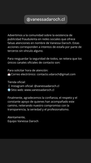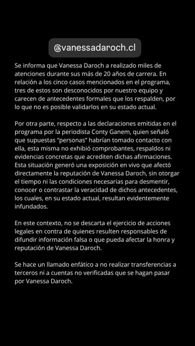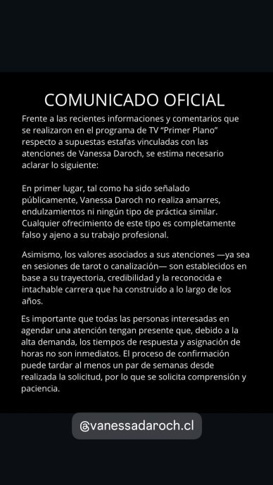El equipo de Vanessa Daroch, emitió un comunicado defendiendo a la tarotista y negando las acusaciones: «En primer lugar, tal como ha sido señalado públicamente, Vanessa Daroch no realiza amarres, endulzamientos ni ningún tipo de práctica similar. Cualquier ofrecimiento de este tipo es completamente falso y ajeno a su trabajo profesional. Asimismo, los valores asociados a sus atenciones, ya sea en sesiones de tarot o canalización, son establecidos en base a su trayectoria, credibilidad y la reconocida e intachable carrera que ha construido a lo largo de los años».