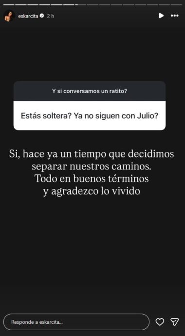 Cuando le consultaron: «¿Estás soltera? ¿Ya no siguen con Julio?», ella respondió sinceramente: «Sí, hace un tiempo que decidimos separar nuestros caminos». Eskarcita aseguró que la ruptura fue en buenos términos y evitó entrar en polémicas o dar mayores detalles.