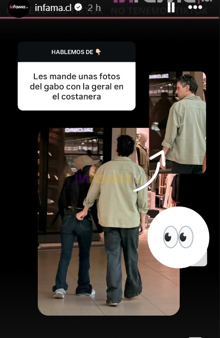 La información fue difundida por la cuenta de espectáculos Infama, que compartió en redes sociales fotografías enviadas por una fuente, donde se ve a Geraldine Muñoz y Gabriel Urzúa caminando juntos en un centro comercial de la capital.