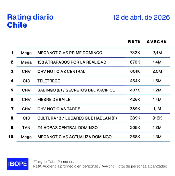 Rating TV Chilena: los programas más vistos del día domingo 12 de abril